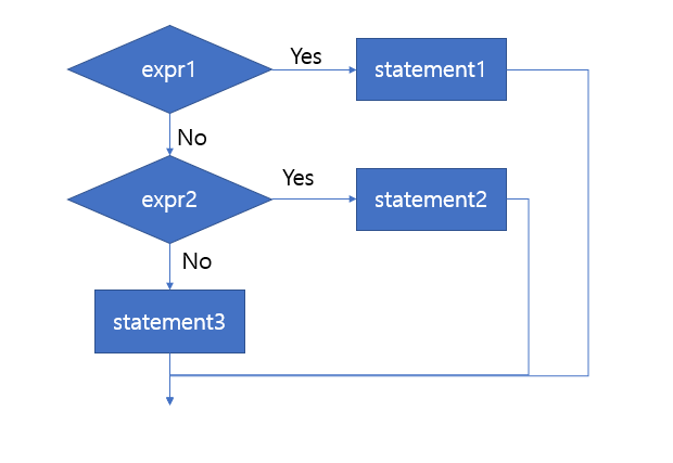 이렇게 복잡한 조건문들을 구성해서 쓸 수 있다. 보기에는 복잡해보이지만 실제로는 단순하다. expr1이 참이면 condition1을 검사한다. condition1이 참이면 statement1, 거짓이면 statement2를 실행한다. expr1이 거짓이면 expr2를 검사해서 참이면 condition3을 체크한다. 이런식으로 중첩된 조건문을 사용하게 된다.