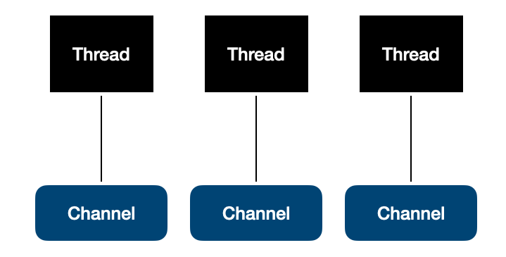 가장 쉬운 방법은 클라이언트마다 스레드를 생성해서 붙여주는 방법이다. 각 스레드는 클라이언트와 연결된 채널에서 기다린다. 즉, 새로운 요청이 올 때까지 채널에 블로킹되어 있다. 서버 프로그램을 구현할 때 가장 쉬운 방식이다.