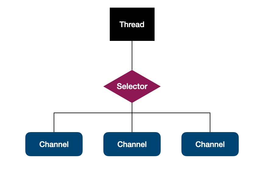Java NIO에서는 Selector라는 컴포넌트를 두고 여러 채널을 등록할 수 있게 했다. 스레드는 셀렉터(Selector)에 등록된 채널 중 가용한 채널이 있는지 알 수 있다. 3개의 채널 중 하나라도 쓸 수 있는 상태가 되면 바로 알 수 있다. 이런 방식을 '멀티플렉싱(MultiMultiplexing)'이라고 한다.