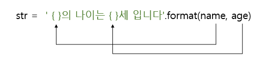 '{}의 나이는 {}세 입니다'라는 문자열은 포맷을 나타낸다. 중괄호 부분인 {}이 어떤 변수의 값을 채우기 위한 자리이며, format() 함수의 인자들의 값이 순서대로 앞에서부터 {} 자리에 채워진다.