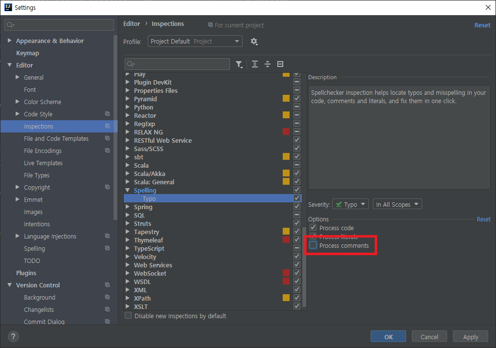 [Editor]-[Inspections] 메뉴를 들어간다. Spellings 항목 중에 Typo 항목을 선택한다. 그러면 오른쪽 옵션에 'Process comments' 항목이 있는데 여기를 체크해제한다.