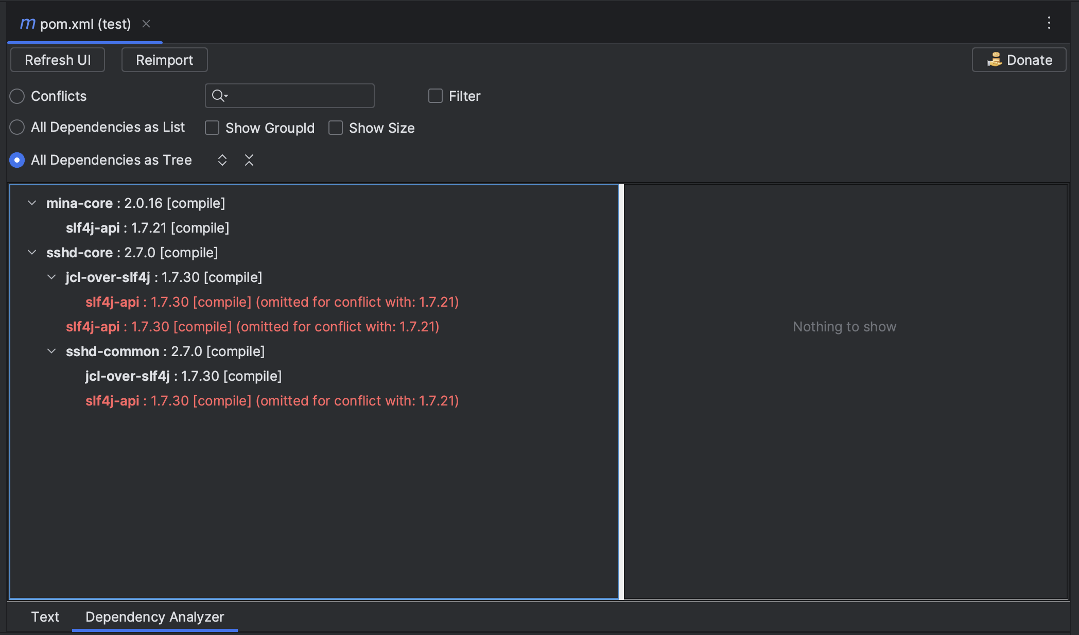 예제로 만들어본 프로젝트에서는 mina-core 라이브러리와 sshd-core 라이브러리가 slf4j-api 라이브러리를 함께 사용하고 있는데, sshd-core 라이브러리의 경우 1.7.30 버전으로 컴파일되었지만 1.7.21 버전으로 로드되어 사용하고 있음을 보여준다. 이 처럼 프로젝트에서 가져다 사용하고 있는 라이브러리들의 버전 충돌 상황을 쉽게 볼 수 있다는 점이 Maven Helper 플러그인의 장점이다.