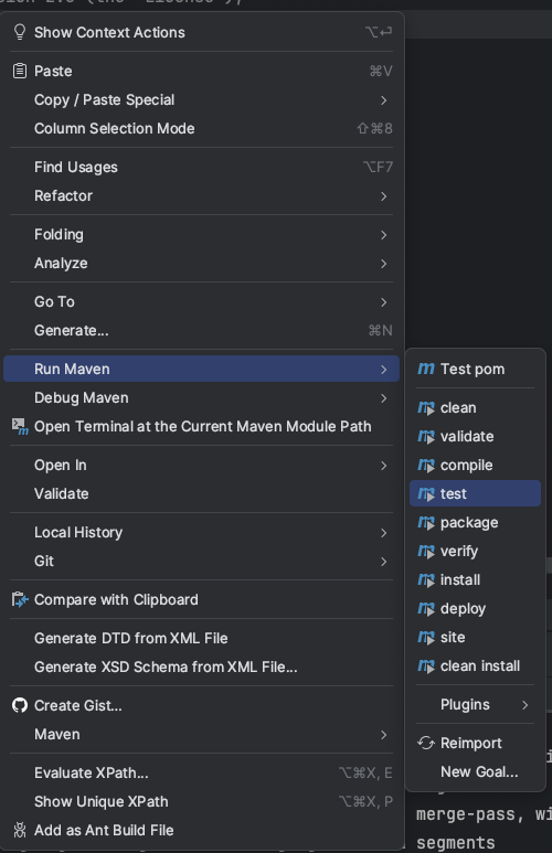 메이븐 골(Goal) 혹은 플러그인을 클릭 몇 번으로 실행할 수도 있다. pom.xml 파일에서 우클릭을 하면 'Run Maven' 항목이 있다.