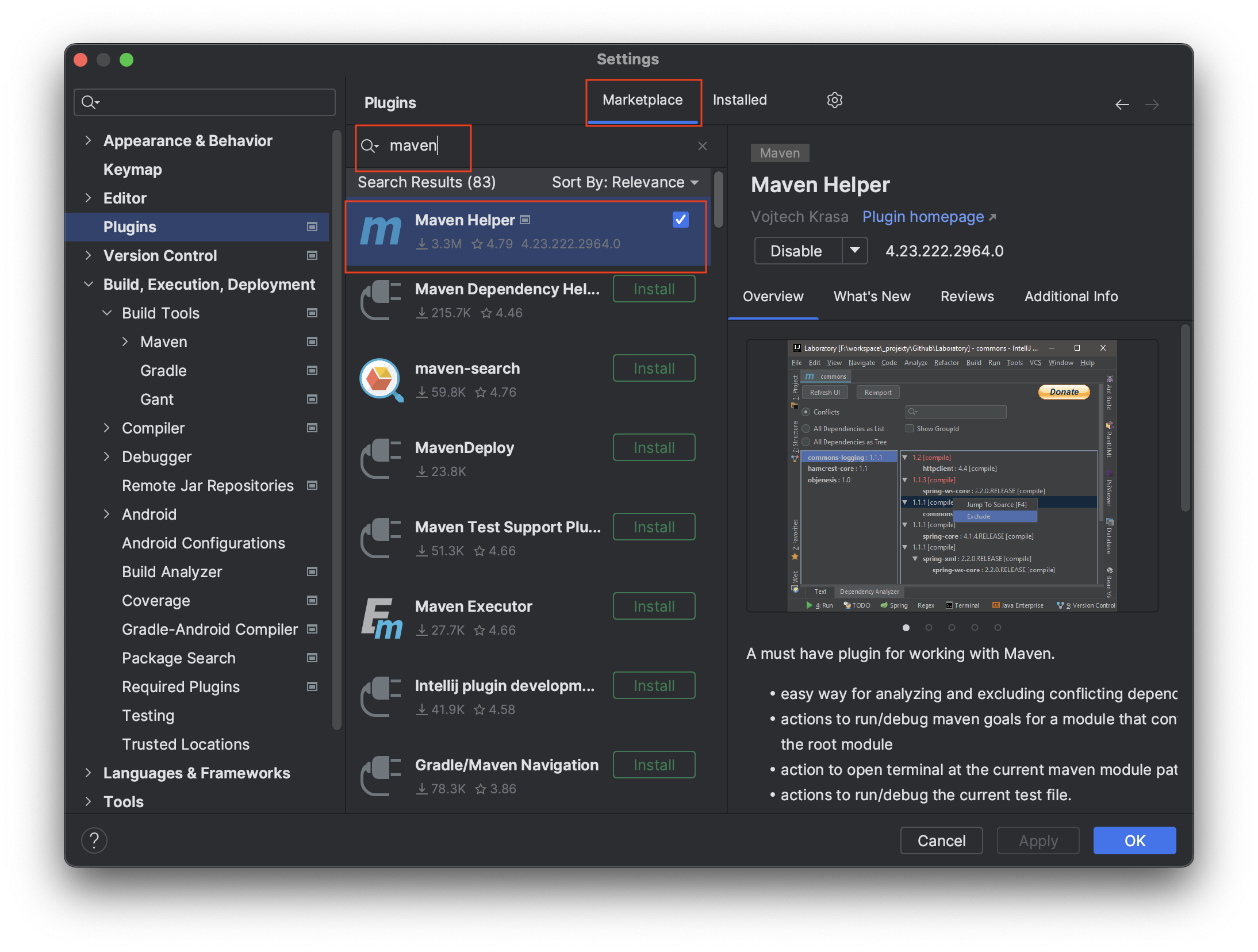 검색 창에 "maven helper"를 치면 Maven Helper라는 플러그인이 나온다. Install 버튼을 눌러서 설치해준다. (위 화면은 이미 설치된 후라서 Install 버튼이 없다)