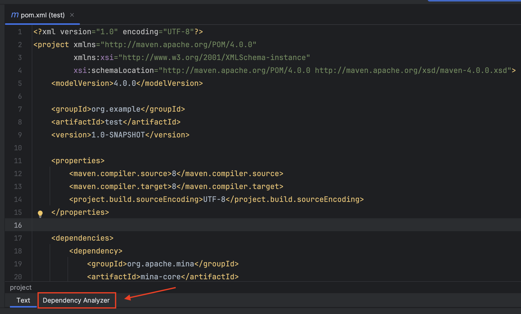 maven helper 플러그인의 가장 유용한 기능인 의존성 분석 기능을 사용해보자. 메이븐 프로젝트의 메타 정보를 담고 있는 pom.xml 파일을 열어보자.