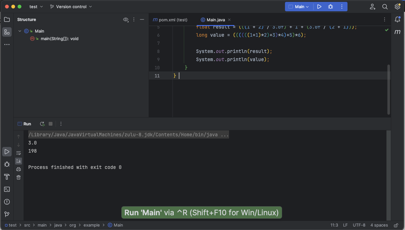 화면 하단에 "Run 'Main' via ^R (Shift+F10 for Win/Linux)" 항목이 출력된다. 자주 사용되는 기능은 단축키를 자주 보게 될테고 결국 단축키로 실행하게 될 가능성이 높아진다.