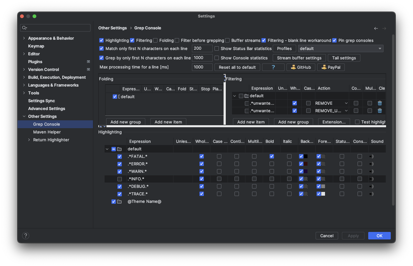 Settings > Tools > Other Settings > Grep Console로 들어가면 Grep Console 플러그인의 설정을 변경할 수 있다. (혹은 콘솔창 오른쪽에 빨간색 Grep Console 아이콘을 누르면된다.) 설정 화면 하단에 있는 Highlighting 섹션에서 패턴을 추가/삭제 할 수 있고, 색상도 변경할 수 있다.