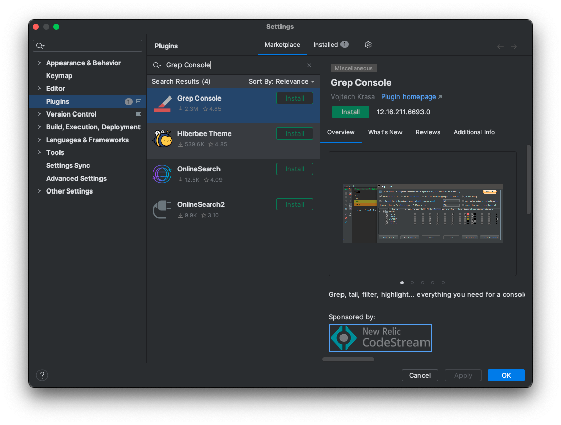 Settings > Plugins 로 들어가서 Marketplace에 Grep Console을 검색하자.