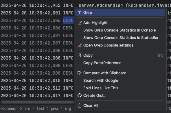 콘솔에서 찾고 싶은 문자열을 드래그한 다음 우클릭을 하고 Grep 항목을 선택하면 된다. 예를 들어 DEBUG를 드래그 한 다음 Grep 메뉴를 선택하면