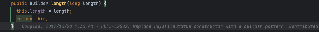 GitToolBox 플러그인이 적용되면 소스코드 에디터의 커서가 있는 부분에 해당 소스코드를 마지막 수장한 사람과 수정한 날짜, 커밋 로그 정보를 흐리게 표시해준다. Annotate with git blame 기능까지 들어가지 않아도 바로바로 소스코드의 수정자와 정보를 알 수 있어서 편리하다.