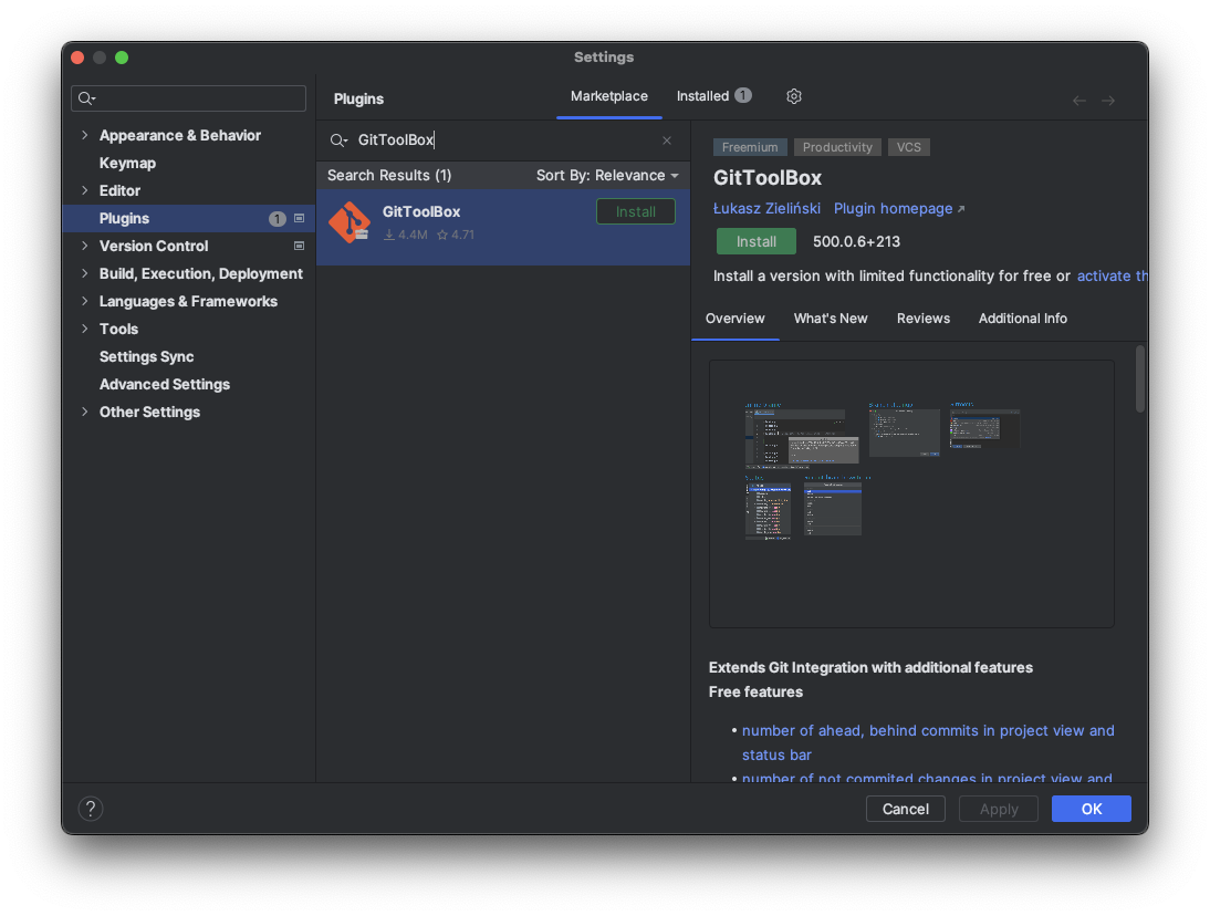 Settings > Plugins > Marketplace에서 GitToolBox를 검색한다.