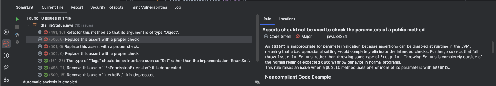 현재 작업중인 소스코드에서 검출되는 코드스멜이나 잠재적인 버그 등을 검출해준다.