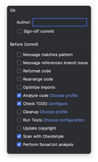 별도로 정적 분석을 실행시키지 않고 변경을 커밋할 때 액션으로 추가할 수도 있다. 인텔리제이의 커밋 설정에 Perform SonarLint analysis 항목이 생긴다. 이를 선택하면 커밋 할 때 코드 분석을 해준다.