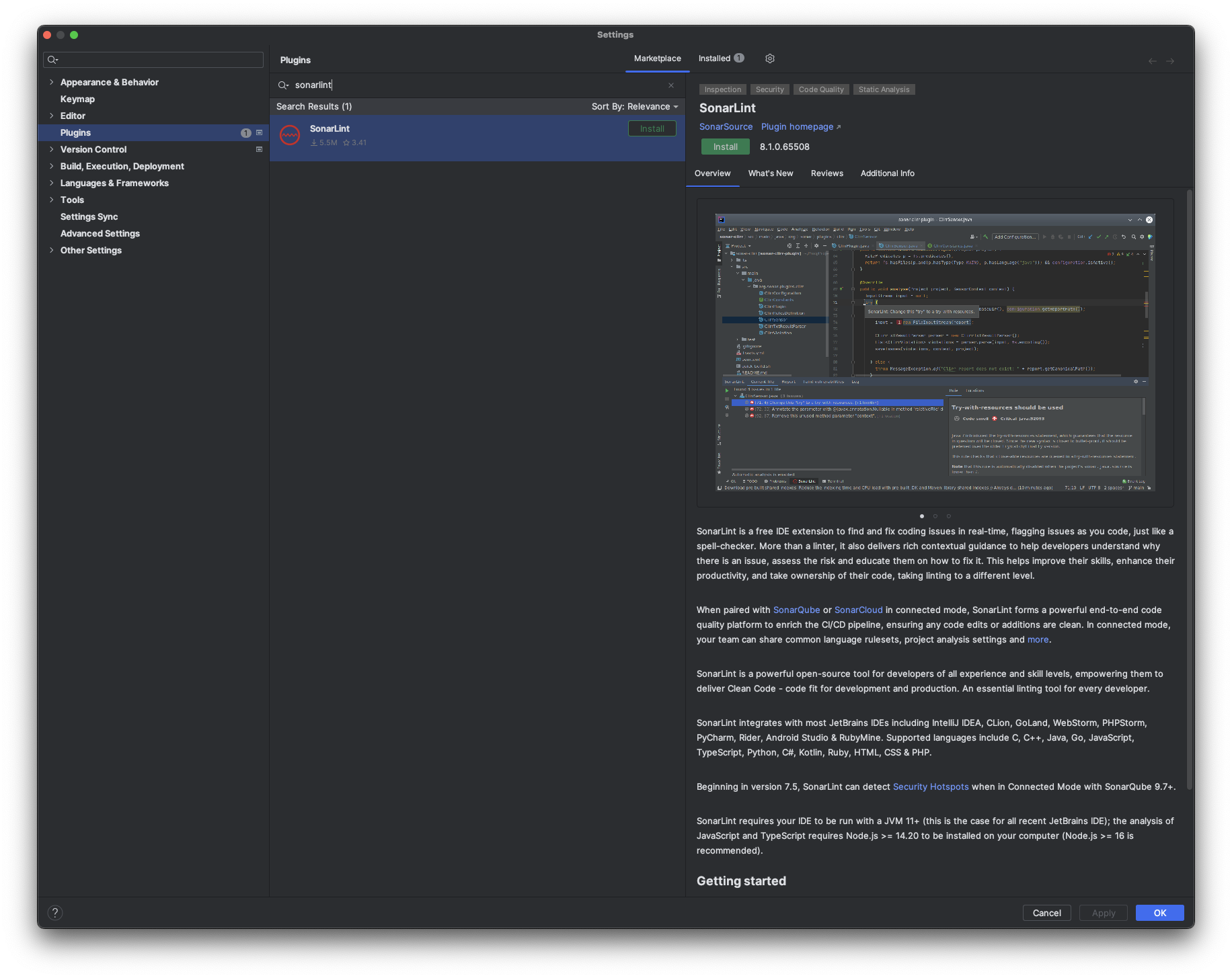 Settings > Plugins > Marketplace 에서 SonarLint를 검색한다.