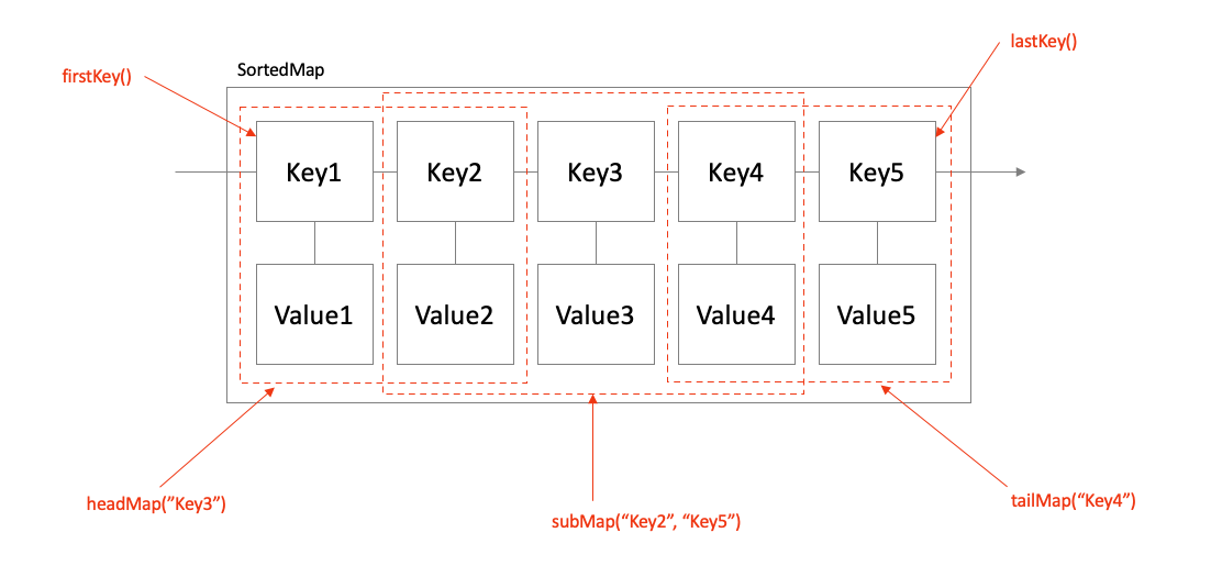 headMap(), tailMap(), subMap() 메소드를 이용해 정렬된 Key-Value 쌍의 특정 부분을 SortedMap으로 리턴받아 가져올 수 있다. 각 메소드에 인자로 넘겨주는 키 값이 리턴되는 SortedMap에 포함되는지 포함되지 않는지를 유의해야한다. fromKey는 리턴되는 맵에 포함되고, toKey는 포함되지 않는다.
