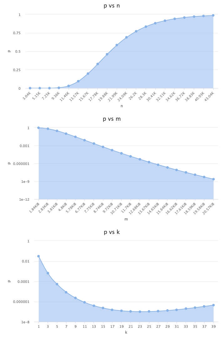 False Positive 확률(p)과 엘리먼트 개수(n), 비트맵 사이즈(m)와 해시함수 개수(k) 사이에는 다음 공식이 적용된다.