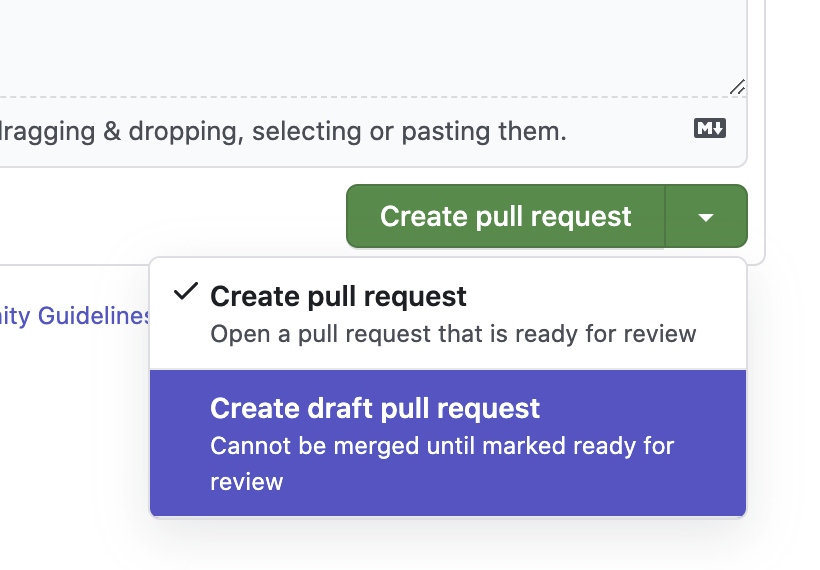 PR 생성을 할 때 "Create pull request" 버튼 옆에 드랍 다운 화살표를 클릭하면